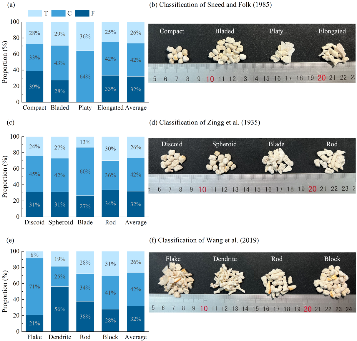 针对以上问题,蒋昌波研究团队对珊瑚砂颗粒沉降运动开展实验研究,通过图像追踪技术,重构了珊瑚砂颗粒的三维沉降轨迹,并基于频谱分析划分了三种不同的沉降轨迹类型,并统计了出现三种沉降轨迹的概率。结果表明,如果随机挑选一颗珊瑚砂颗粒,那么这三种沉降运动模式(翻滚运动(Tumbling)、混沌运动(Chaotic)、摆动运动(Fluttering))发生的概率分别约为26%、42%和32%。