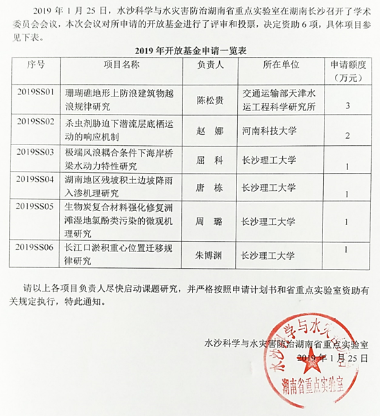 2019年水沙科学与水灾害防治湖南省重点实验室开放基金项目批准通知
