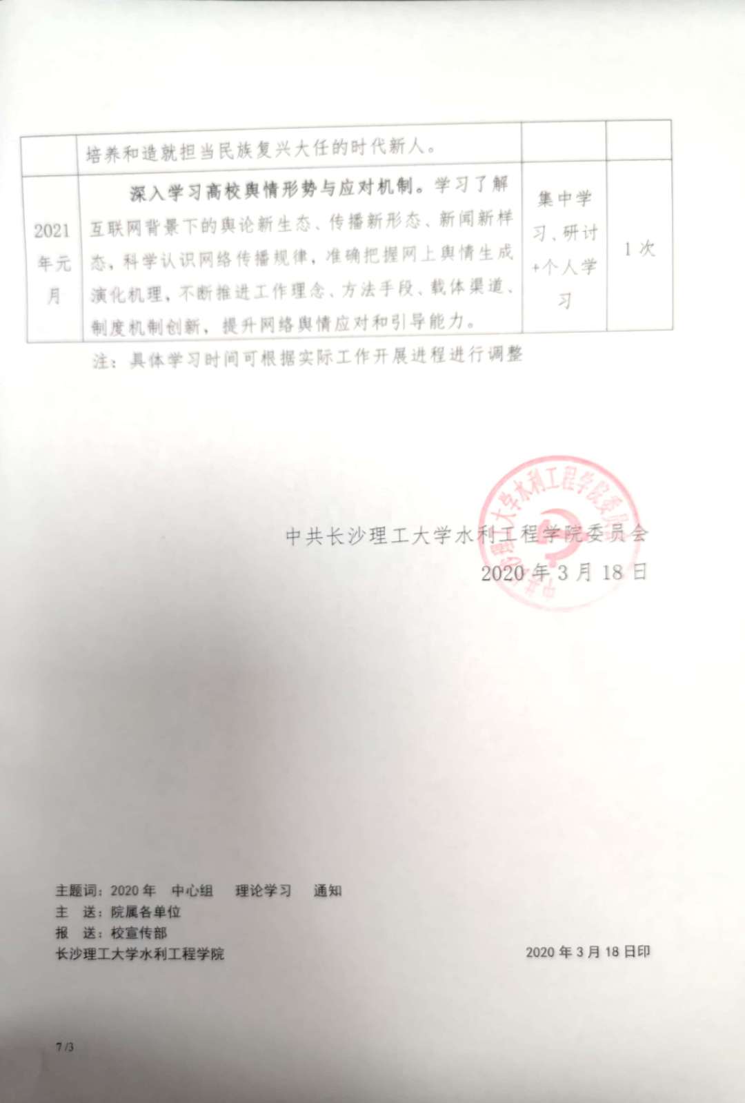 水利工程学院关于2020年党委中心组理论学习安排(长理工大水利党【2020】01号)