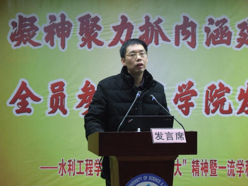 水利工程学科负责人、副校长蒋昌波做“凝神聚力,砥砺前行,共创水利工程学院新辉煌”报告,详细分析了学院学科发展现状,提出了“坚持发展理念,坚持以师生为中心,坚持全面深化改革,坚持抓重点、补短板、强弱项”的发展思路,从专业建设、学科建设、平台建设、打造队伍、国际化、体制和机制6个方面阐述了今后的行动计划。