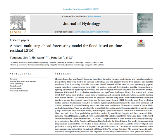 引用格式:Zou, Y., Wang, J., Lei, P., & Li, Y. (2023). A novel multi-step ahead forecasting model for flood based on time residual LSTM. Journal of Hydrology, 620, 129521.