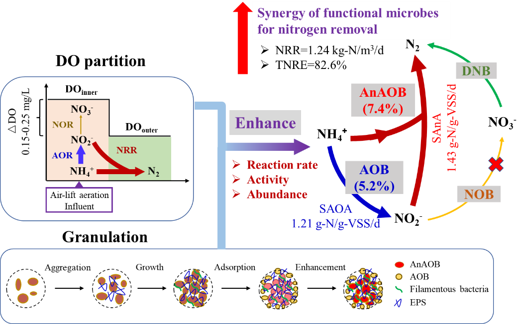 近日,我院18级硕士生王泓(导师:陈宏)以开云kaiyun体育水利与环境工程学院为第一单位和通讯单位在环境生物技术领域顶级期刊《Bioresource Technology》(中科院一区TOP期刊,IF=9.642)发表题为“Insights into the synergy between functional microbes and dissolved oxygen partition in the single-stage partial nitritation-anammox granules system”的研究论文。