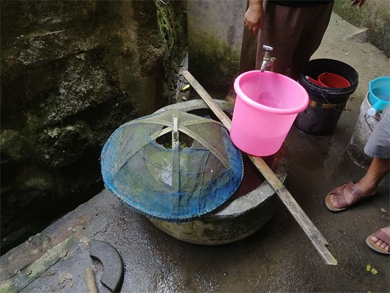 上午调研团抵达双峰县井字镇镇政府,在双峰县水资源管理局副局长李永强及井字镇水利站副站长李朝晖带领,实践团下村拜访村民及进行问卷调查。在三石村我们采访了居民赵女士,赵女士介绍到村落附近紧挨山泉又有灌溉井,家中虽未接通自来水但一年四季并不缺水,且水质良好,口感甘甜,她对饮用水水质十分满意。而采访的长湾村居民彭奶奶情况却大有不同。长湾村住户都已接通自来水管道,但因彭奶奶家地势较高同时位置较偏,水压不足而无法取用自来水。目前彭奶奶家与邻家共打一口井抽水,但又逢旱季井水短缺,用水情况不容乐观。李副站长对此介绍说长湾村由多个组合并而成,各组间亲疏关系有别,彭奶奶家只与邻居来自同一组,故在自来水建设中没有人特意考虑他们家的地势因素。其他村子基本都在去年完成自来水管建设,水源分别来自水厂、山泉水和井水,村中几乎没有停水的情况,水质清凉甘甜,居民对政府自来水建设工作基本满意。