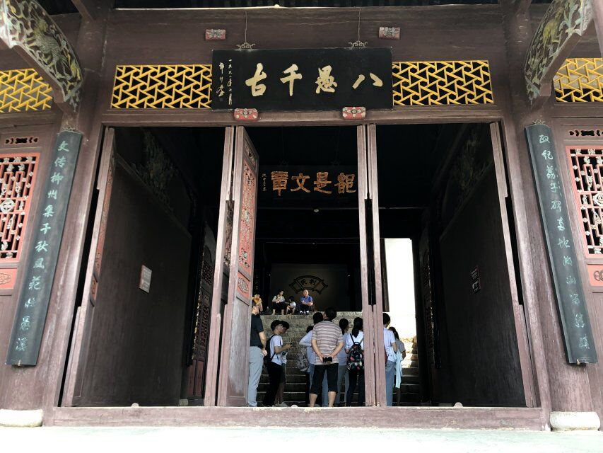 庙门上镌有“柳子庙”三字石刻,两旁楹联“山水来歸黄焦丹荔,春秋报事福我壽民”。工作人员介绍到柳公子厚,一心利民,楹联缅怀柳宗元的“利民之举”。进门可见,庙为三进三开。首先是一座现存十分少见的清代建筑风格的双檐八柱的大戏台。穿过戏台,牌匾上写着“山水绿”,出自柳宗元的《渔翁》中的“烟销日出不见人,欸乃一身山水绿”,旨在赞叹永州的山好水好。走上楼梯是二进中殿,门额悬着“八愚千古”的牌匾;再走近是三进正殿,门额牌匾写的“都是文章”,赞叹柳宗元“出口下笔都是文章”.
