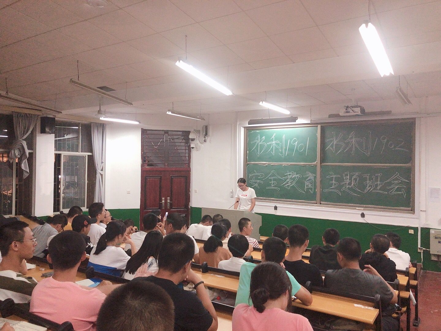 为进一步加强学生安全教育管理,提高学生安全防范意识,切实保障学生的人身财产安全和校园稳定。2019年9月29日晚8点,水利工程学院2019级各班级在金盆岭14教自习室召开了安全教育主题班会,班会由各班班长主持。
