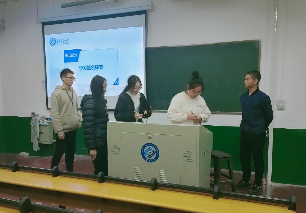 班会开始前,班长强调了班会纪律并提醒同学们认真听讲、做好笔记。会议伊始,班长对四级考试和期末考试的相关注意事项进行了介绍,并针对重点要求做了详细注解和反复强调。随后,班长带领同学们逐字逐条学习了修改后的《开云kaiyun体育学生考试违规处理办法》,让同学们了解并自觉遵守考规考纪,诚信应考。同时还列举了3起因考试舞弊被开除学籍的反例为大家讲述了考试作弊的危害和严重后果,警示同学们绝对不可心存侥幸进行考试舞弊。在最后的宣誓和签字环节中,同学们一齐喊出“全力备考、诚信应考”的誓词,排队签下自己的名字时,这微凉的空气中,每一颗火热的心脏都在猛烈的跳动。