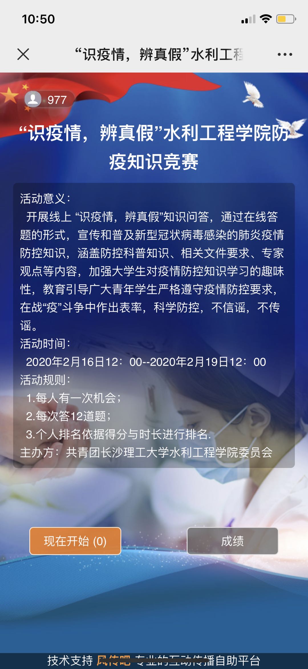 为引导水利学子全面掌握新型冠状病毒的防护知识,提高自我防病意识,增强水利人打赢疫情阻击战的信心和决心,水利工程学院在2月17日至2月20日期间组织开展了“识疫情·辩真假”水利工程学院网络防疫知识竞赛。
