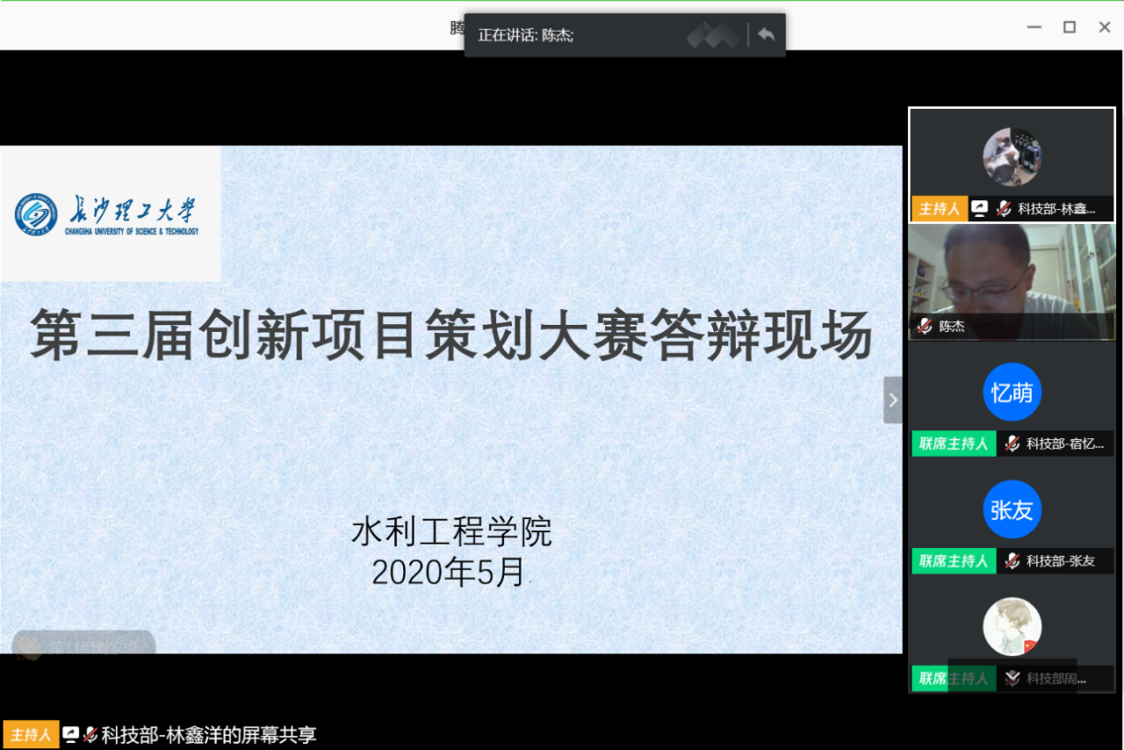 5月5日晚,水利工程学院在腾讯会议上举行开云kaiyun体育第三届创新项目策划大赛学院选拔赛答辩会。担任本次比赛的评委有水利工程学院副院长陈杰,专业教师禹丽娥、陈龙,院分团委书记杜丘。经过第一轮的筛选,共有15个项目入围本次答辩。