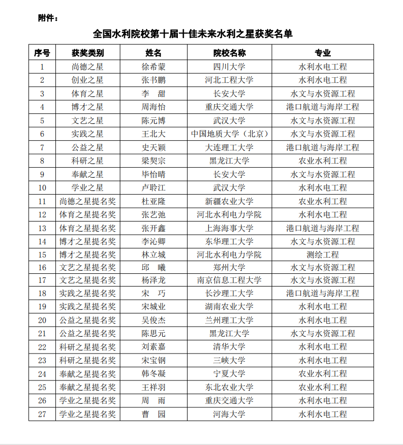 全国水利院校十佳未来水利之星评选活动自2011年以来已成功举办九届,旨在弘扬“忠诚、干净、担当,科学、求实、创新”的新时代水利精神,展现当代水利类专业大学生新风貌,进而引导全国水利类专业在校学生刻苦学习、奋发向上,培养素质过硬、能力出众、道德高尚的水利后备人才。评选分为学业成绩、道德风尚、科研创新、创业实践、技能拓展、实践调研、文化艺术、体育竞技、社会服务、校园贡献十个类别。本次评选有来自清华大学、武汉大学、大连理工大学、河海大学等开设水利专业院校的优秀学生参选。由中国水利教育协会组织专家对参评候选人进行第一轮评审,全国水利院校的学生代表进行第二轮投票,最终角逐出了10名十佳未来水利之星以及17名提名奖获得者。