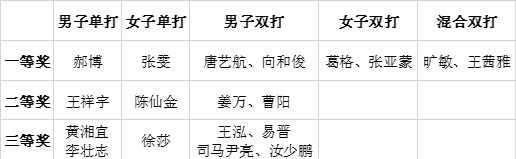 本次比赛分别决出男女单打前三名,男女双打和混双第一名,具体比赛结果见下表。研究生辅导员刘灿老师给各位获奖选手颁奖并合影。