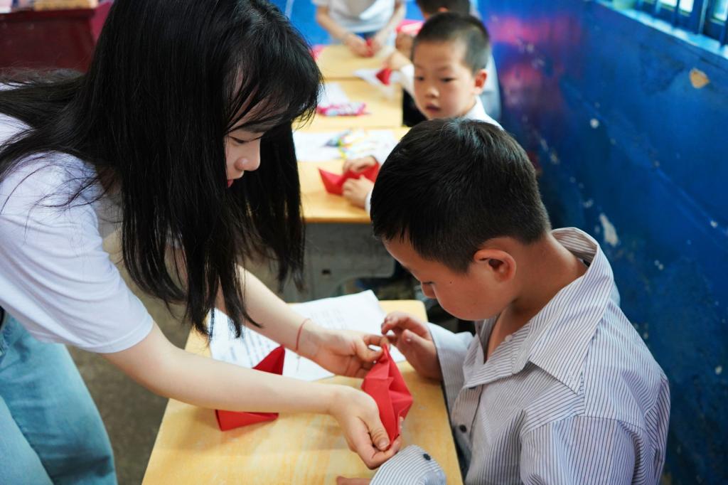 在其他教室,志愿者还带领小朋友们开展了“小党旗”制作、“一反常态”“飞花令”系列活动。在和小朋友们一同高唱《我爱祖国》《团结就是力量》等红色歌曲后,水文特岗团支部罗筱翔说:“这次活动让我加深了对学史力行的理解,通过进乡村、进课堂,以我们自己的方式引导小朋友们童心向党,涵养爱国心、爱党情,这个儿童节非常有意义。”