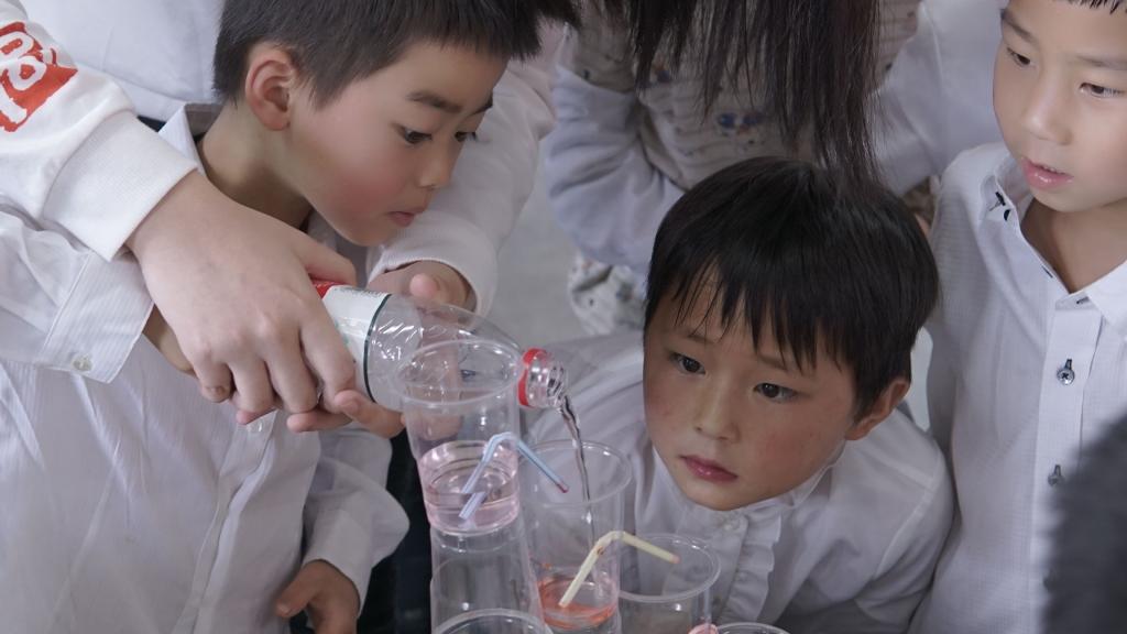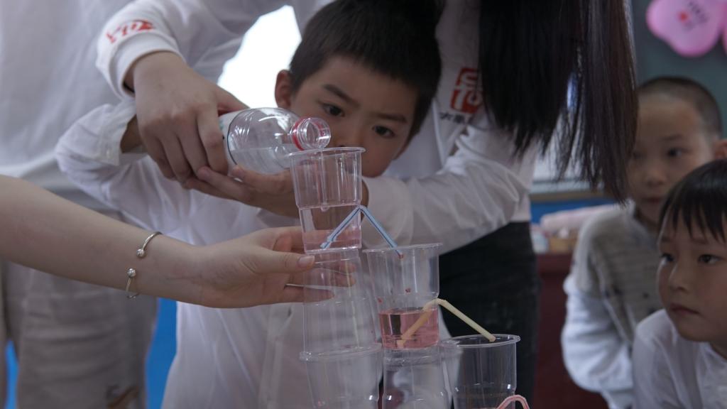 “老师,你快看,水自己在走呀,好神奇……”在三年级的教室里,“大禹之子”志愿者带着小朋友们亲身体验虹吸现象小实验。在量杯、吸管的叠加组合间,“水”在实验小器材中瞬息变化,引来小朋友们一阵阵惊叹。通过志愿者的讲解和示范,小朋友们感悟着水文化和知识的魅力。在“滴水成河”的互动游戏中,小朋友们秒变成“小雨滴”根据不同的数字进行报团组合,模仿雨滴汇聚成水的过程,在组合的失败与成功中感受百川归海的艰难历程,增强保护水资源的意识。