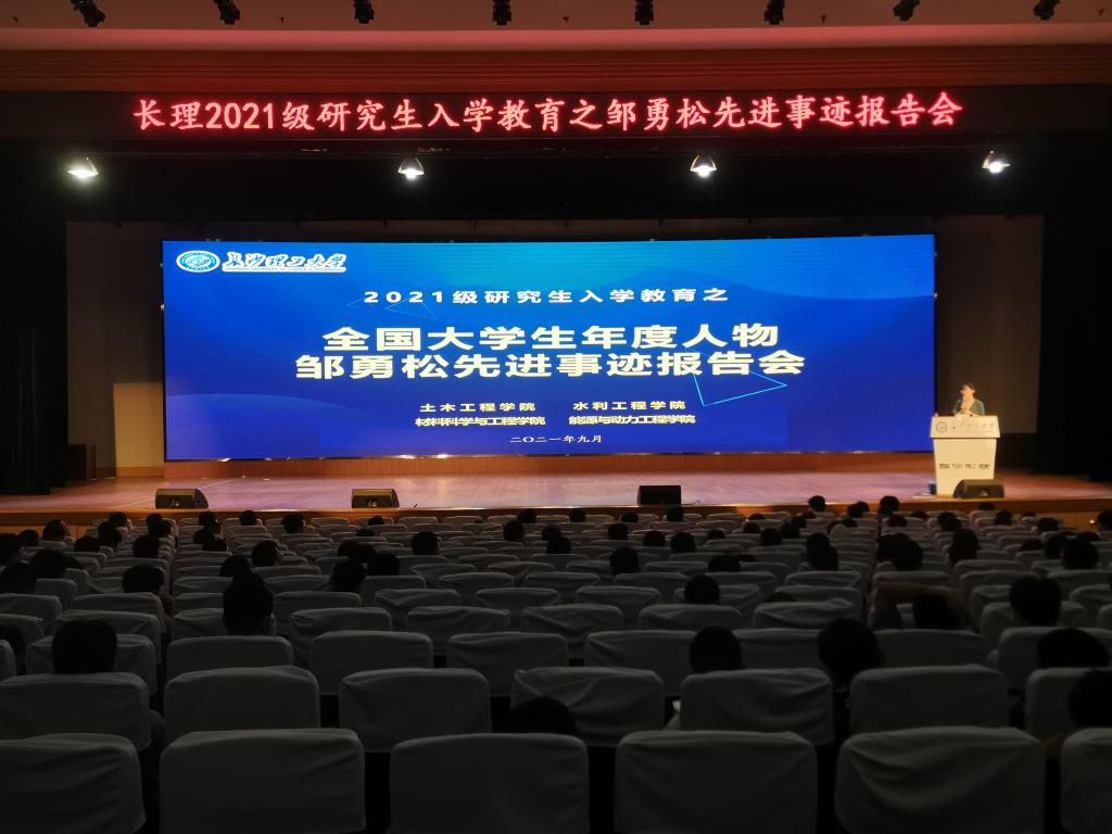 9月13日晚7点,水利学院在金盆岭校区5教大礼堂举行2021级研究生入学教育之先进事迹报告会。水利学院2019级博士研究生、全国大学生年度人物邹勇松主讲,水利、土木、能动以及材料学院600余名研究生新生参加。会议由水利学院研究生辅导员杜丘主持。