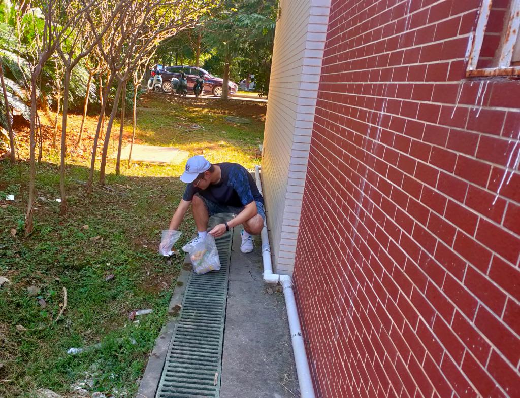 下午14:00,学生在公寓门前集合完毕,按照门外、院内及外围不同区域分成小组进行清洁。大家拿着自带的工具对负责区域各个角落进行垃圾清理、铲除牛皮癣,并引导和整理好宿舍楼外电动车摆放。两个小时汗流浃背的清洁中,整个公寓楼变得清爽干净了。