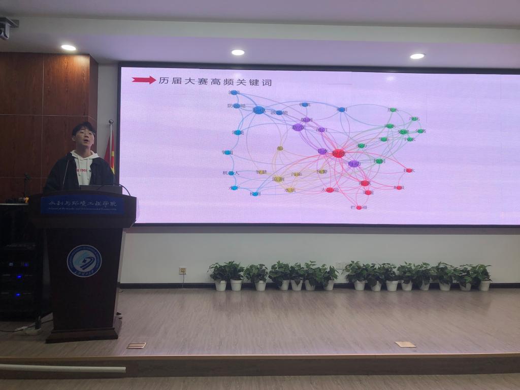 汪磊详细地向同学们介绍了全国大学生水利创新设计大赛的赛制及要求,重点分析了全国水利创新设计大赛自举办以来发生的变化以及对获奖作品的共性特点进行了全面剖析。