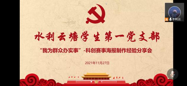 11月27日,水利云塘学生第一党支部在腾讯会议上开展了“我为群众办实事”科技竞赛海报制作经验分享交流会,交流会由郝运琪、陈力然主讲,第二届“大禹杯”水利模型创新设计大赛参赛选手参加,会议由闫露伟主持。