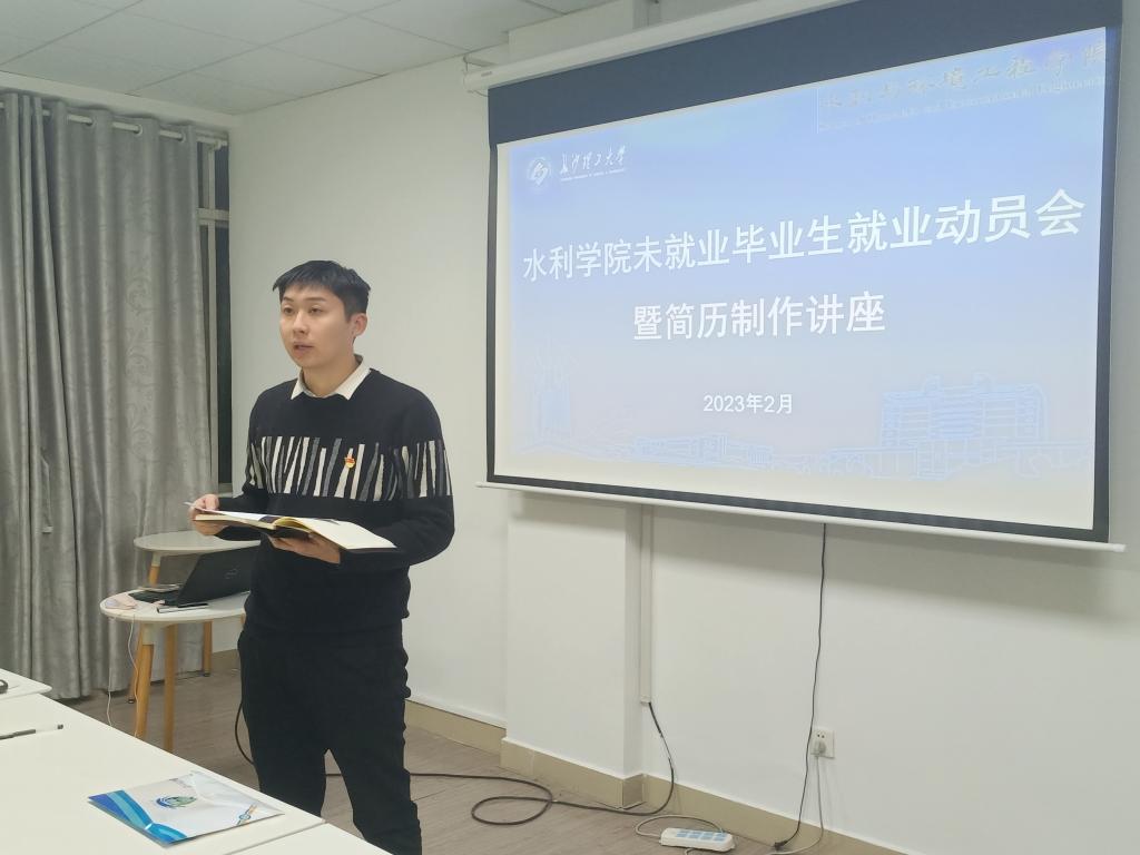 2月27日晚7:00,水利与环境工程学院在工三B448召开在校未就业毕业生动员会,水利学院就业专干甯子豪、2023届在校未就业毕业生参加会议。