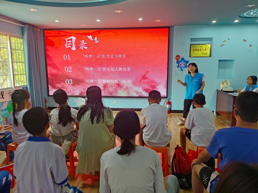 “你们在暑假开展宣讲活动很有意义,不仅让中小学生学习了‘两弹一星’的知识,还能引导他们热爱祖国,好好学习,欢迎你们以后常到社区来开展活动。”涂新社区党支部书记王晓讲到。
