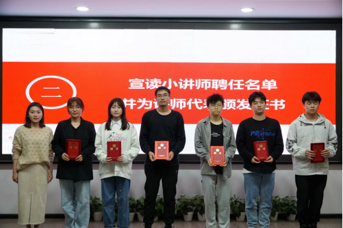 最后,黄婷分别为第一期优秀朋辈小讲师颁发“金牌小讲师”荣誉证书,并为第二期“朋辈讲师”颁发聘任证书,她阐明了学业帮扶活动的由来和成立朋辈学业帮扶讲师团的用意,并以优秀的辅学助学案例和翔实的帮扶数据总结了上学期“水润朋辈课堂”取得的巨大成效,要求工作负责人完善工作保障机制,进一步丰富辅学形式,整合帮扶资源,希望讲师们坚持以学员为中心,全方位、多角度了解帮扶对象的实际困难,倾听心声,提供帮扶,将互帮互助精神融入课堂,培养一批批小讲师。