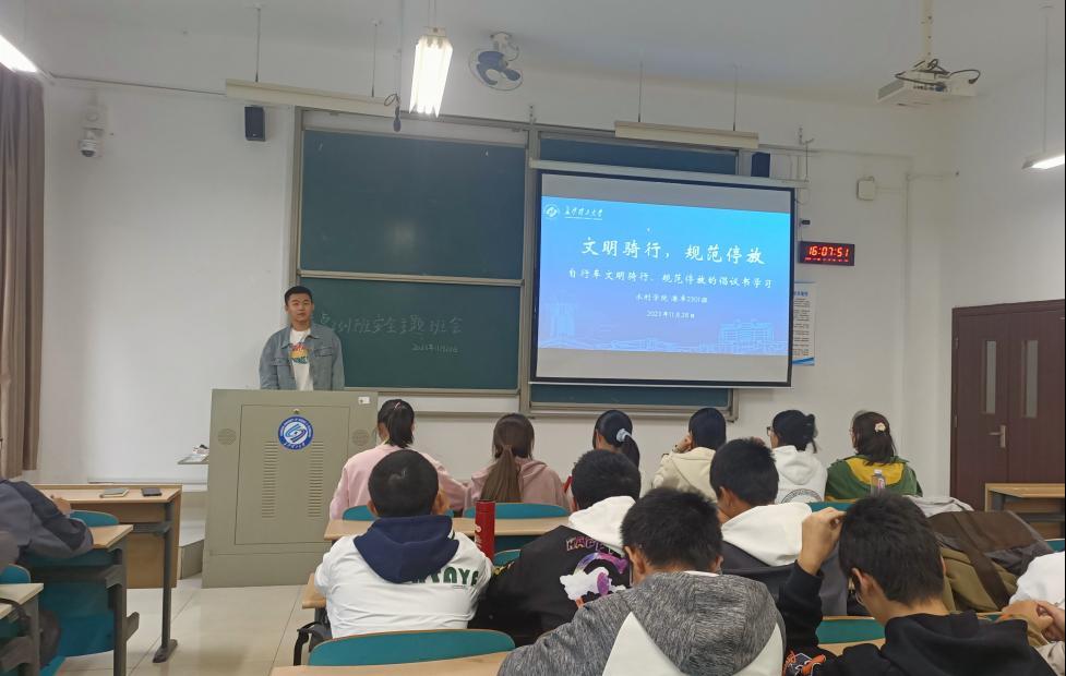 本次班会紧密围绕“消防安全”、“交通安全”、“防骗反诈”、“毒品预防”等方面开展,各班班委、党员领学《健康人生绿色无毒——毒品预防教育宣传手册》、《关于自行车文明骑行、规范停放的倡议书》、《防范电信网络诈骗,十个凡是的建议》等文件手册,通过集体学习、知识问答、案例分析、视频观看、问题研讨等多种方式普及安全知识,引导同学们增强自我安全防范意识,提升自我保护能力,树立积极向上的心态,共同维护校园的安全稳定。在研讨环节,水利2204班夏宇轩同学认为“自行车乱停乱放影响正常出行,每个同学都应该做文明骑行者,维护校园良好秩序。”“通过学习毒品预防教育宣传手册,认识了常见类型毒品,增强了自我辨别能力。”给排水2301班谢彦兮同学说道。