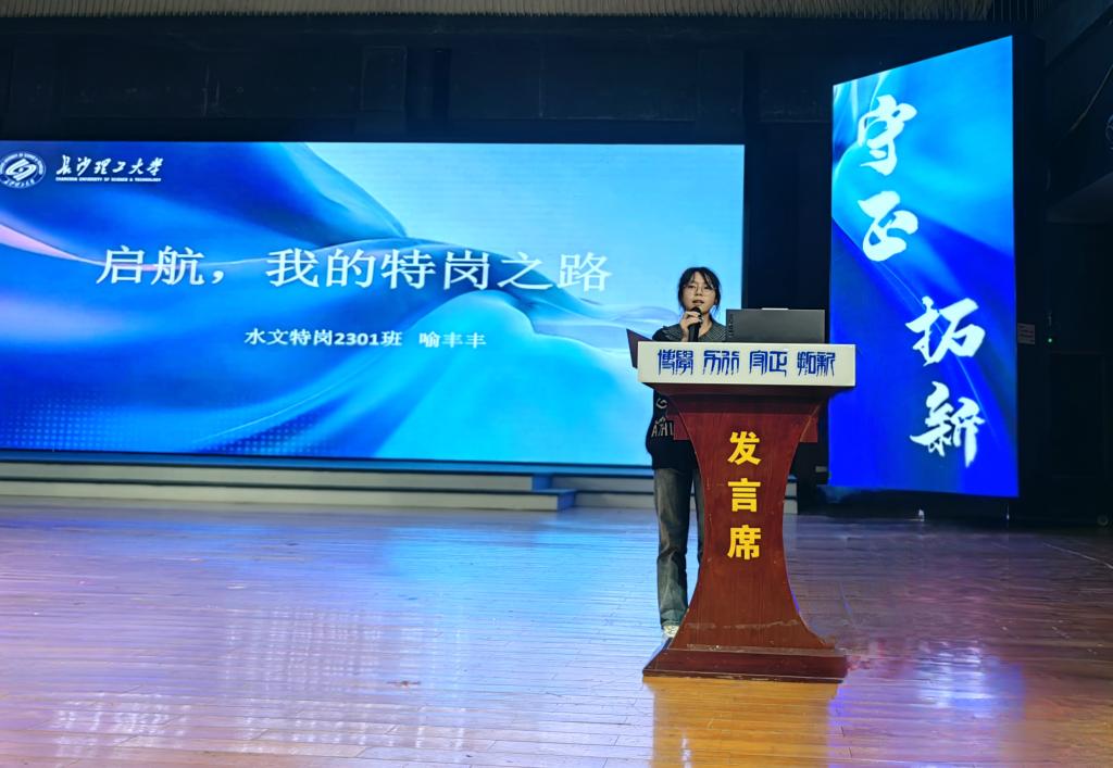 水文特岗2301班喻丰丰以“启航,我的特岗之路”为题分享了自己寒假在平江县水利局跟岗实习的经历,在基层岗位数十年的老前辈对水利事业的坚守让她感触颇深,她希望自己能如他们一样,成为一滴水,融入祖国和民族的发展潮流之中。