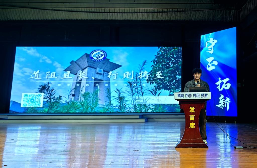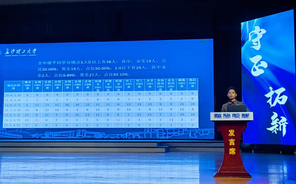 “让勤奋学习成为青春飞扬的动力......”张海林对年级整体学习情况进行分析,表扬了取得优异成绩的班级和个人。他从绩点极差值、平均学分绩点排名、挂科寝室分布、课程补考通过率、英语四级通过率等多方面分析年级整体成绩情况,希望同学们找不足、补短板、促提升,重视学习,塑造卓越学风。