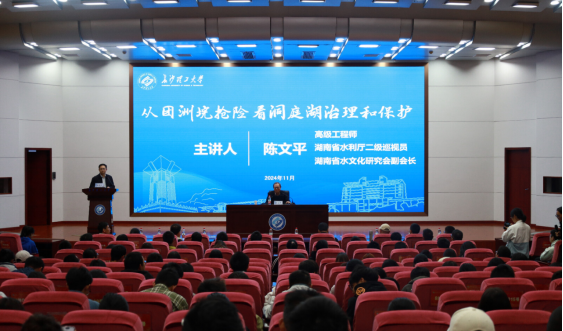 11月19日下午,湖南省水利厅二级巡视员、湖南省水文化研究会副会长、高级工程师、我校水工专业80级杰出校友陈文平应邀来到在云塘校区图书馆报告厅作题为“从团洲垸抢险看洞庭湖治理与保护”的专题报告。水利学院院长陈杰主持此次报告会,学院党委副书记银波、副院长邓斌、专业教师和辅导员代表,水利特岗生、第十二期青年马克思主义者培训班学员和大禹之子青年志愿者协会的学生代表等300余人现场聆听报告。