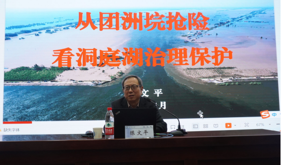 “洞庭湖是一块瑰宝”“洞庭湖是一座迷宫”“洞庭湖是一个命题”“万里长江,险在荆江,难在洞庭”,陈文平引用诗词名句,通过视频照片生动描绘展示了洞庭湖的壮丽风景与情况特点,通过历史变迁、治理成效与当前形势的对比,展示了洞庭湖的发展历程。“没有抢不住的险,只有没发现的险”,陈文平详细介绍了今年亲历团洲垸溃垸抢险的详细过程,作为抢险指导专家陈文平不仅为工作人员做思想工作,还细致落实了各项措施,确保了抢险工作的顺利进行。他指出,目前洞庭湖面临的主要问题包括:淤积萎缩、湿地生态系统退化和通航条件恶化,这些问题的严重性不容忽视,需要全社会共同努力解决。他表示,未来的洞庭湖应该是安澜洞庭、生态洞庭、粮仓洞庭、数字洞庭、美丽洞庭、幸福洞庭。