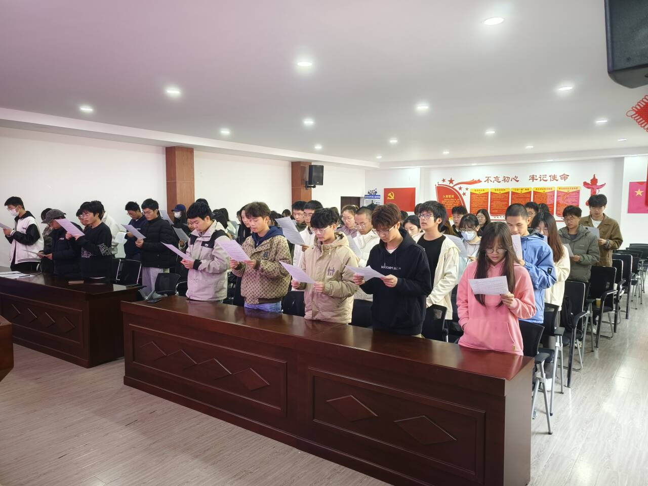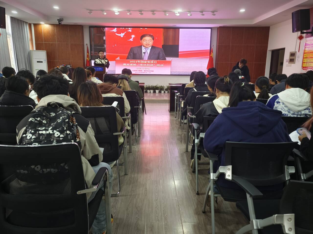 为深入贯彻宪法精神,积极推进社会主义法治文化建设,在第十一个全国宪法日,水利学院精心组织了各年级各班级70余名学生代表,在工三B319教室举行了“宪法晨读”活动。此次活动通过教育部全国青少年普法网的直播平台,实现了跟读宪法、学习宪法的教育目的。