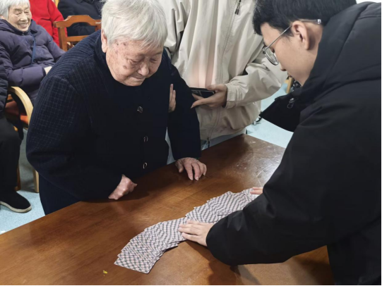 现场不仅有欢快的歌曲表演,还有扑克魔术、“乒乓球穿越”“吹火变花”等精彩的魔术秀,这些神奇的魔术表演让老人们眼前一亮。养护院的工作人员表示:“魔术表演很新奇,你们真是用心了!老人们很喜欢你们的表演,兴致很高。”表演魔术的符晴贸同学说:“看到爷爷奶奶脸上开心的笑容,我们心里很温暖也很有成就感。这是一段爱意双向奔赴的美好时光,希望我们带来的这份快乐可以一直延续下去。”