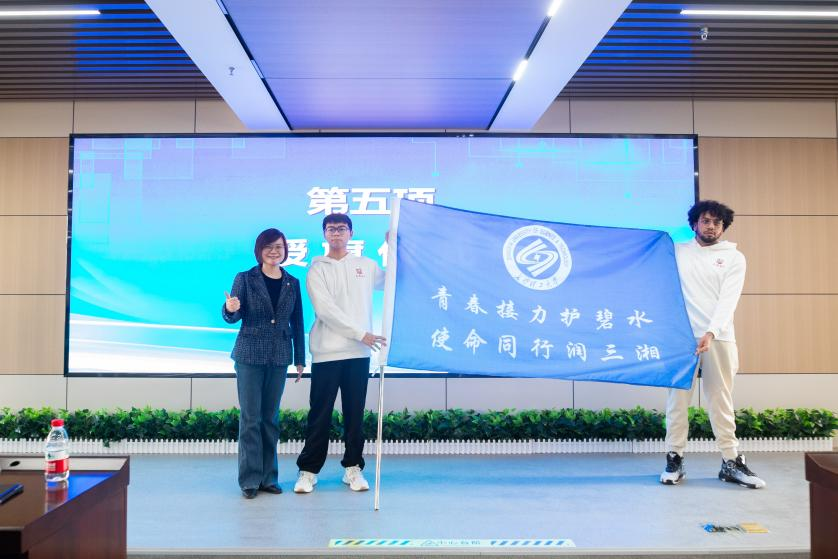 湖南省水利厅团委书记朱如意为“大禹之子”青年志愿者协会志愿者代表授旗。在飘扬的旗帜下,志愿者们共同宣誓:“以青春之名,护生命之源”,誓将青春力量奉献于节水护水活动。