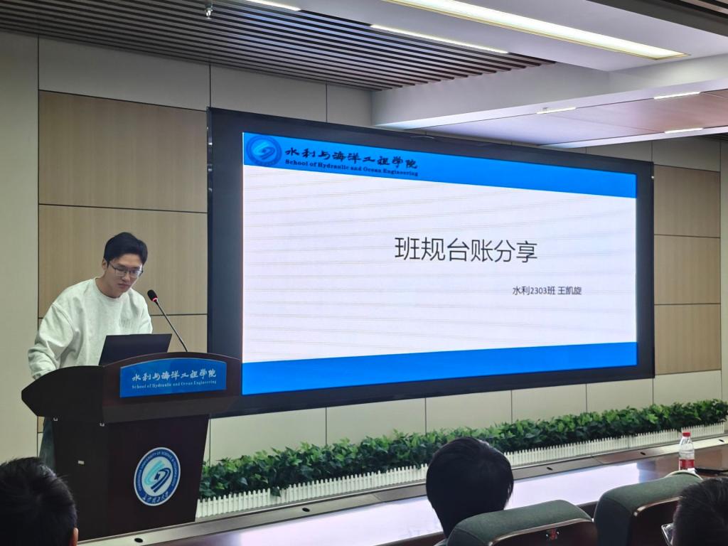 在经验分享环节,水利类2303班班长王凯旋围绕学业促进、寝室管理、文体活动与学科竞赛组织等多个维度,对班级台账制度的具体实施情况进行了深入解读。他指出“科学合理的班规是班级有序管理的重要保障,而详实准确的台账则为班级同学日常表现提供了客观记录,是学院开展评优评先工作的重要参考依据”。