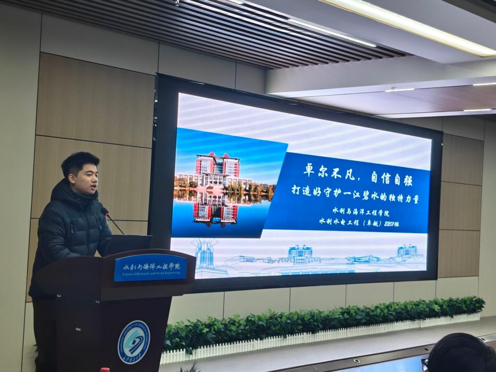 水卓2201班团支书蒋宇轩以校级示范班集体建设成果为切入点,分享了在思想引领、学术创新、团队凝聚与文化建设等方面的成功经验。他分享到“打造具有鲜明特色的班级品牌、明确班级建设目标、制定系统的建设规划是推动班级持续发展的关键”。