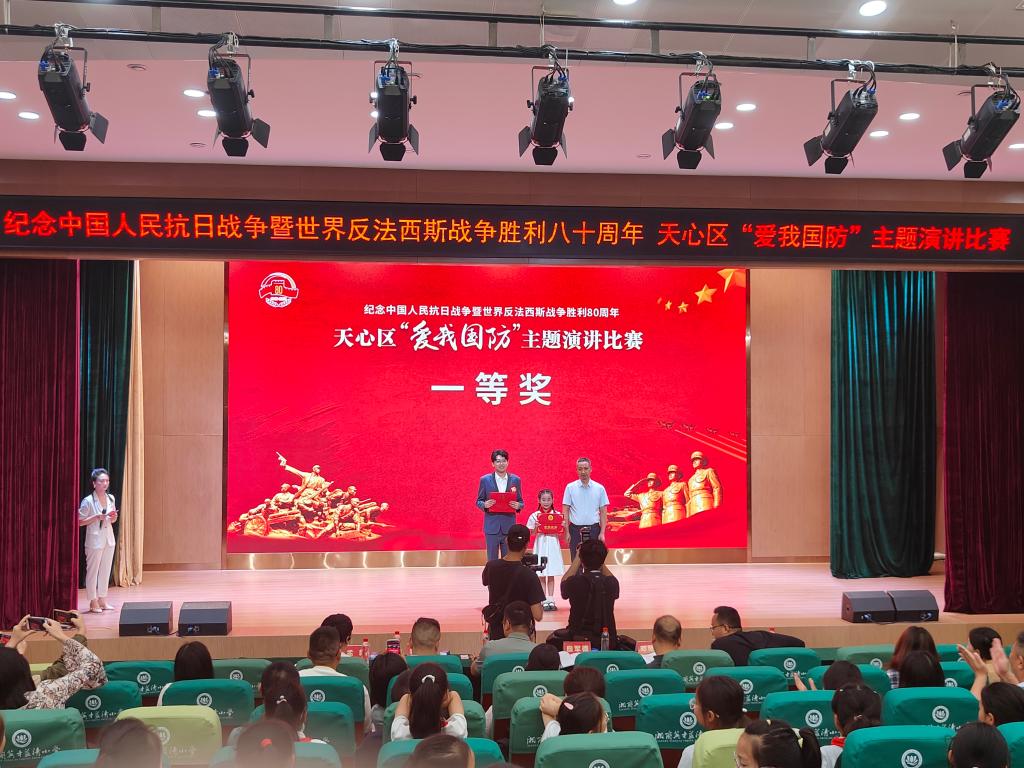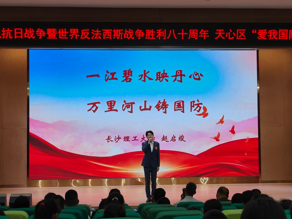 5月28日,为纪念中国人民抗日战争暨世界反法西斯战争胜利80周年,由中共长沙市天心区委宣传部主办的“爱我国防”主题演讲比赛在湘府英才益清小学隆重举行。本次比赛汇聚了天心区各高校、中小学及企业单位的14名优秀选手,水利学院环工2302班赵启竣同学凭借出色表现,荣获一等奖!