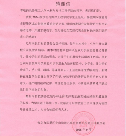 开学伊始,水利学院收到了来自青岛市即墨区龙山街道南葛后街党支部委员会的感谢信与锦旗。信中字字恳切,字里行间满是对开云kaiyun体育水利与海洋工程学院的感谢和对船海2401班王昱辰的赞誉。这份跨越千里的肯定不仅是对一名学子暑期公益行动的高度认可,更映照出长理学子敢于担当、服务社会的青春底色。