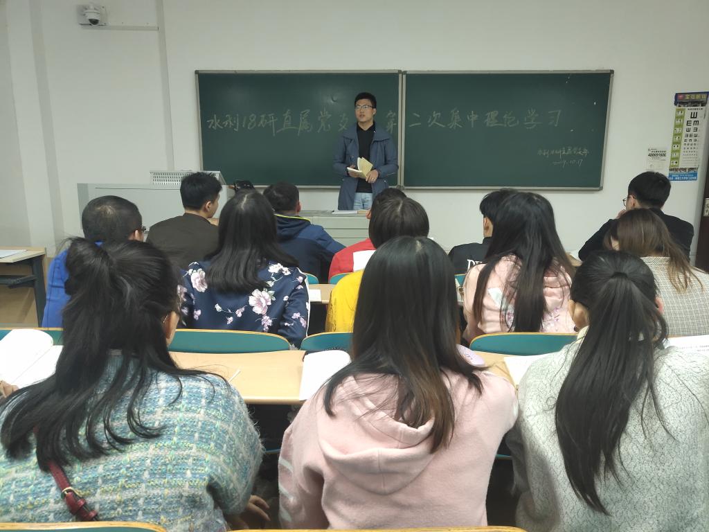 10月17日晚,水利工程学院2018级研究生党支部开展“不忘初心、牢记使命”主题教育第二次集中理论学习。会议由支部副书记郭慧主持,支部全体党员参加。