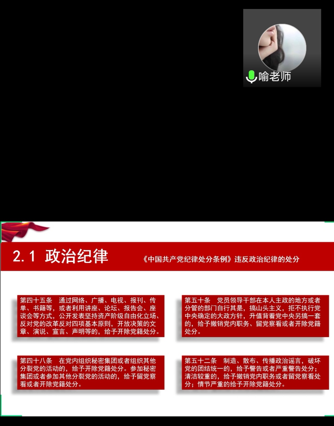 5月13日19:00,水利工程学院党委书记喻玲娜通过腾讯会议平台,以《党的纪律》为主题为水利、物电、艺术学院第11期发展对象联合培训班授课。