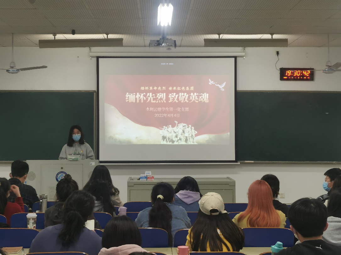 为贯彻党的十九届六中全会精神,深入开展党史学习教育,从百年党史、革命烈士中汲取奋进力量,弘扬红色文化,传承革命精神,以中华传统节日—清明节为契机,2022年4月4日19时30分,水利云塘学生第一党支部在综教C208教室开展“缅怀革命先烈,传承红色基因”主题观影活动,学习观看《清澈的爱,只为中国》纪录片。