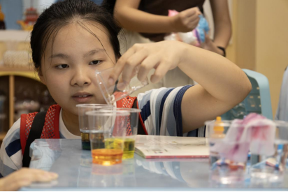 在“彩虹塔桥”的实验中,志愿者将不同颜色的色素涂抹在纸巾的两端,中间留出一定距离,随后缓慢地将纸巾两端分别浸入两杯透明的水中。刹那间,如同彩虹般的色彩仿佛被架设了一座桥梁,彼此相连。孩子们睁大了眼睛,发出连续的惊叹声,并纷纷靠近仔细观察这一现象。