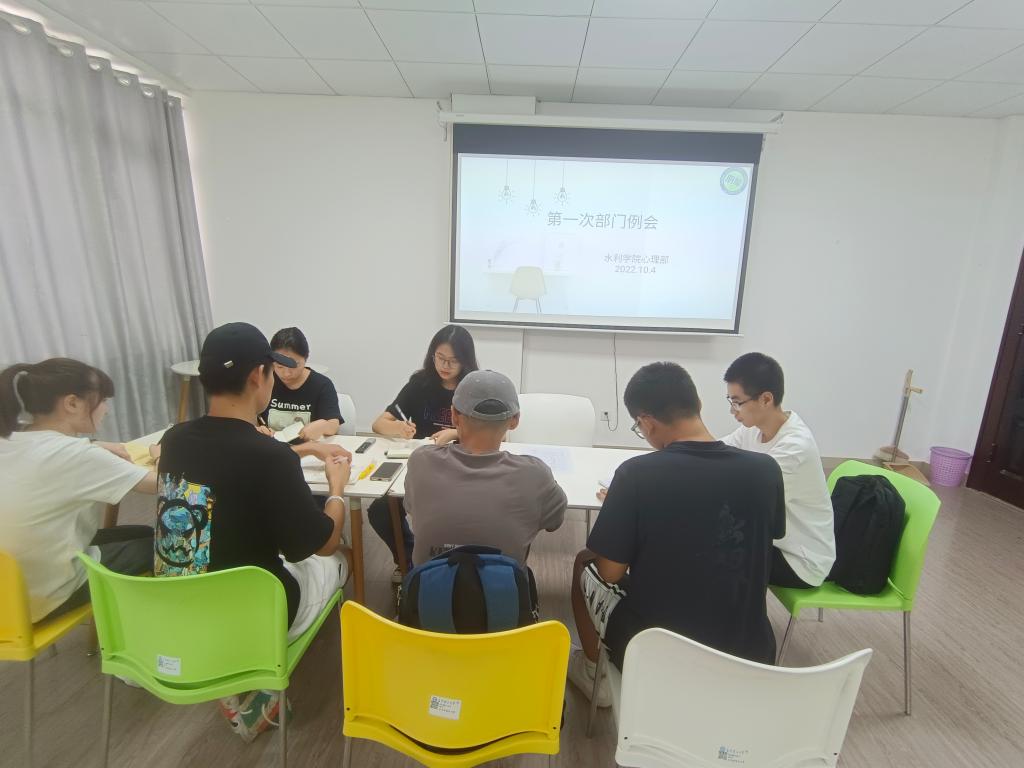 10月4日,水利与环境工程学院心理部于云塘校区工三B448召开心理部第一次部门例会,学生会主席刘汪哲、心理部成员参加会议。