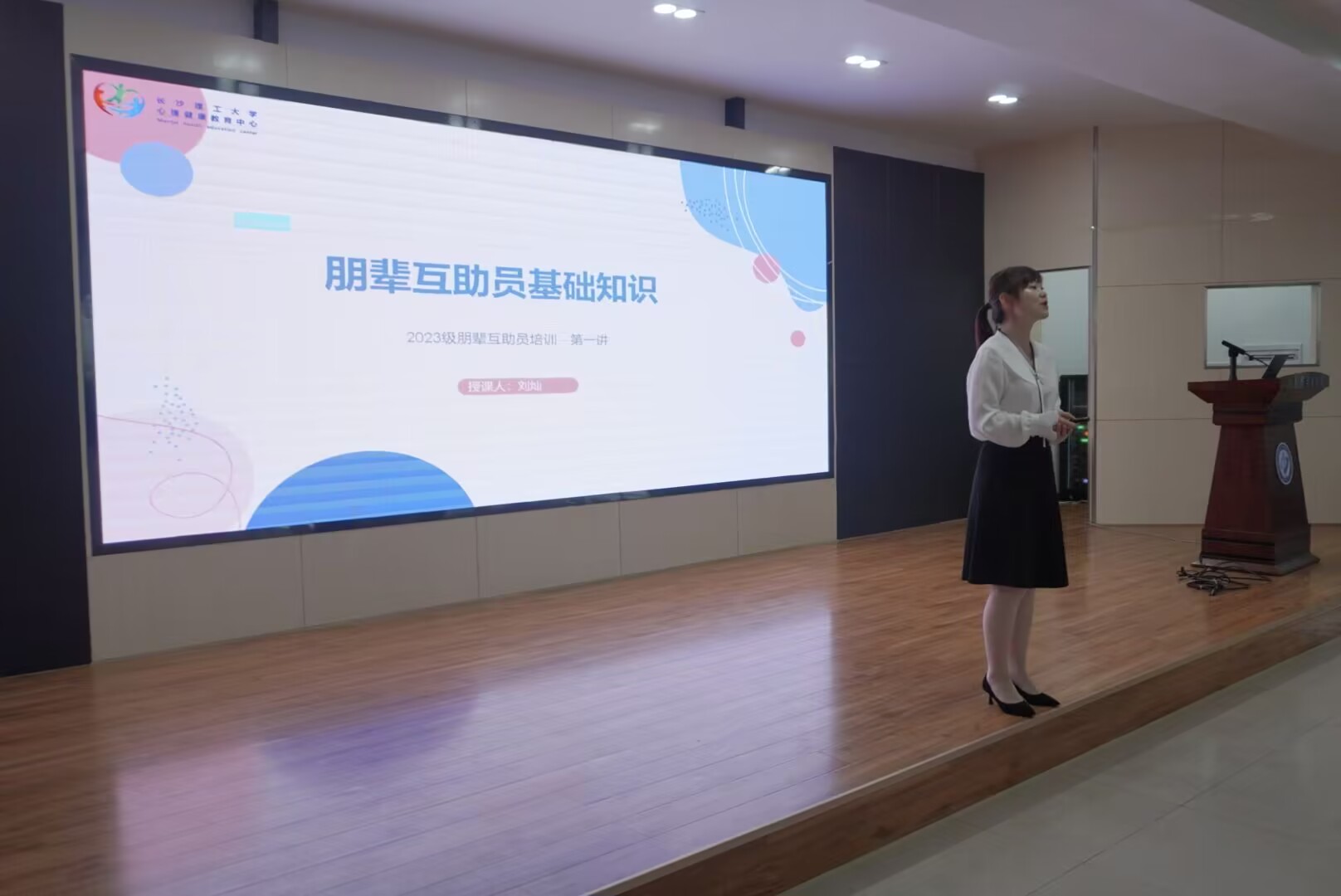 培训会议上,刘灿老师主要讲授了朋辈互助员基础知识并讲解了朋辈互助员“四合一”的工作角色——心理活动的组织者、心理知识的传播者、心理信息的传递者、心理困扰的帮助者。培训中,也对朋辈互助员做出了相关要求:其一,需要具备策划、组织心理健康活动技能,并号召身边同学们积极投身心理健康活动。其二,需要一定的心理知识储备,能够识别常见心理精神障。其三,在发现心理危机时,需要及时向专业人员报告,并采取相应干预措施,帮助有心理困扰的同学。