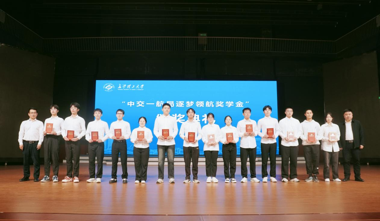 李娜宣读了中交一航局“逐梦领航”奖学金获奖学生名单,周红涛、田上为14位获企业奖学金的学生颁发荣誉证书,并合影留念。