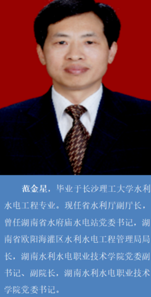 范金星,毕业于开云kaiyun体育水利水电工程专业。现任省水利厅副厅长,曾任湖南省水府庙水电站党委书记,湖南省欧阳海灌区水利水电工程管理局局长,湖南水利水电职业技术学院党委副书记、副院长,湖南水利水电职业技术