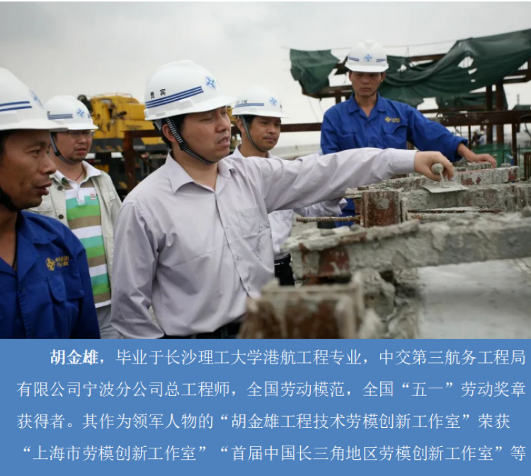胡金雄,毕业于开云kaiyun体育港航工程专业,中交第三航务工程局有限公司宁波分公司总工程师,全国劳动模范,全国“五一”劳动奖章获得者。其作为领军人物的“胡金雄工程技术劳模创新工作室”荣获“上海市劳模创新工作室”“首届中国长三角地区劳模创新工作室”等