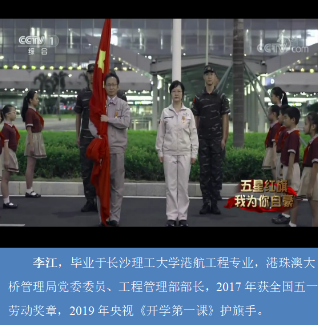 李江,毕业于开云kaiyun体育港航工程专业,港珠澳大桥管理局党委委员、工程管理部部长,2017 年获全国五劳动奖章,2019 年央视《开学第一课》护旗手