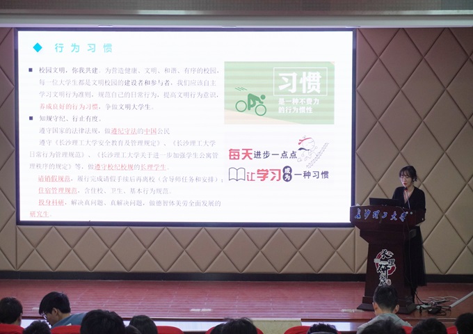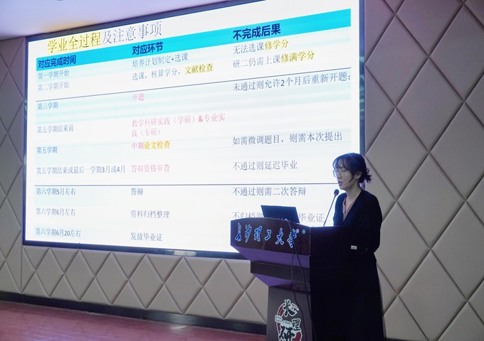 杜丘老师详细梳理了学业流程,清点了教学科研实践及专业实践的注意事项,重点讲解了答辩资格审查与盲审规定,提醒同学们要规范整理学位归档材料。随后杜丘老师依次就行为习惯、停车规范和内务整理进行了具体阐述。她强调,研究生应养成良好的行为习惯,做到知规守纪、行止有度,倡议大家文明骑行、规范停车,并呼吁大家积极进行卫生大扫除,营造干净舒适的工作室和寝室环境。