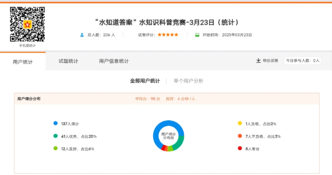 活动依托“水闻天下”微信公众号,每日推送涵盖节水护水、河湖长制、法律法规等专题内容,并通过次日答案解析巩固学习成效。赛事累计产生有效答题超8700次,陈如玉、陈施羽等20名同学凭借高分脱颖而出,甘泽宇等143人实现“连续7天参赛且均分75分以上”,参赛者通过系统学习了《中华人民共和国水法》、“江河战略”等知识,深入了解我国水资源现状及治水新理念。