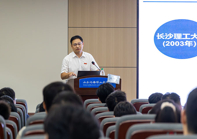 陈杰以“在艰辛而幸福的求学路上活出自己的精彩”为主题,回顾了学院自1956年以来的发展历程,重点介绍了在学科、专业、平台、政策等方面的发展情况。他指出学院已构建完整的“本科-硕士-博士-博士后”人才培养体系,拥有湖南唯一“水利工程”一级博士点、湖南首个“土木水利”专业博士点、“水利工程”博士后工作站,以及“海洋工程”专业博士二级点、“市政工程”二级博士点