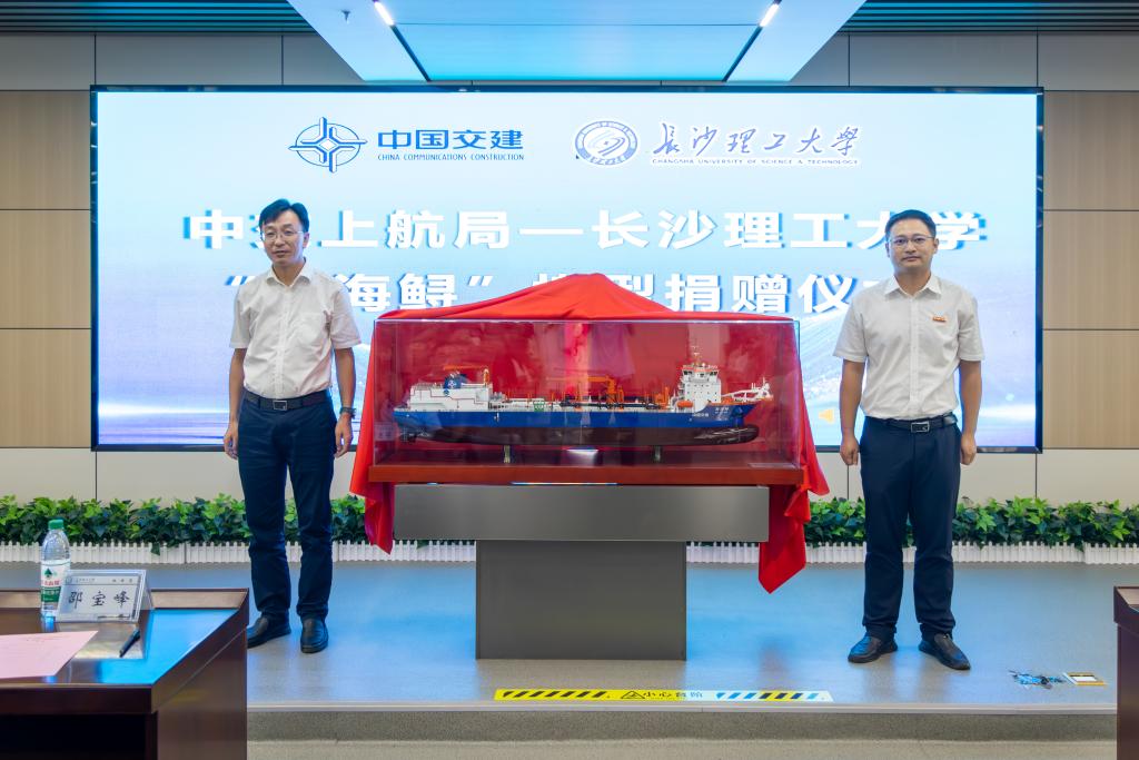 “‘新海鲟’轮由中交上航局自主研制,是目前全球最大、国内首艘采用双燃料动力的大型耙吸挖泥船,具备绿色、环保、节能、安全等显著优势。”,在全体师生的共同见证下,程绪红与陈杰共同为“新海鲟”轮模型揭幕,预示2025级研究生扬帆起航,更是校企合作的深度融合生动体现。