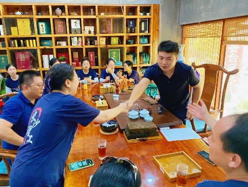 八角茶业具有高标准生态化茶园,生产口感清甜醇厚的茶叶,茶叶深受消费者的喜爱。当日上午,实践团与八角茶业第三代掌门人龚意诚先生就安化县茶旅融合产业发展现状、安华黑茶可持续发展道路所遇瓶颈、未来发展方向等诸多问题进行交流。龚意诚先生向实践团介绍:八角茶业从最初一片3.8亩茶园,一个几十平方米的家庭小作坊发展到如今拥有3条现代化生产线,日处理鲜叶能力达到4万公斤以上的茶业大企,老中青三代茶人共守一方茶园,既是一穷二白时期的拓荒者,也是乡村振兴时期的守山人。同时,他们在发展自身产业时也不忘带动当地茶农共同发展,从第一代掌门人龚寿松老先生带动茶农一起做茶,到第二代掌门人邓超芝女士鼓励农民做茶,通过收购的方式辅助茶农逐步脱贫,再到第三代掌门人龚先生专门设立基金帮助没钱读书的学生完成学业,公司利用政府整合的412万元涉农资金,在马路镇洞马、四房等6个村采取“公司+基地+农户”模式,发动80%以上农户种茶。公司为农户免费提供种苗、肥料、技术指导等,并以保底价收购茶叶,已带动1648人脱贫,真正实现了自己富起来的同时帮助乡亲们也富起来。